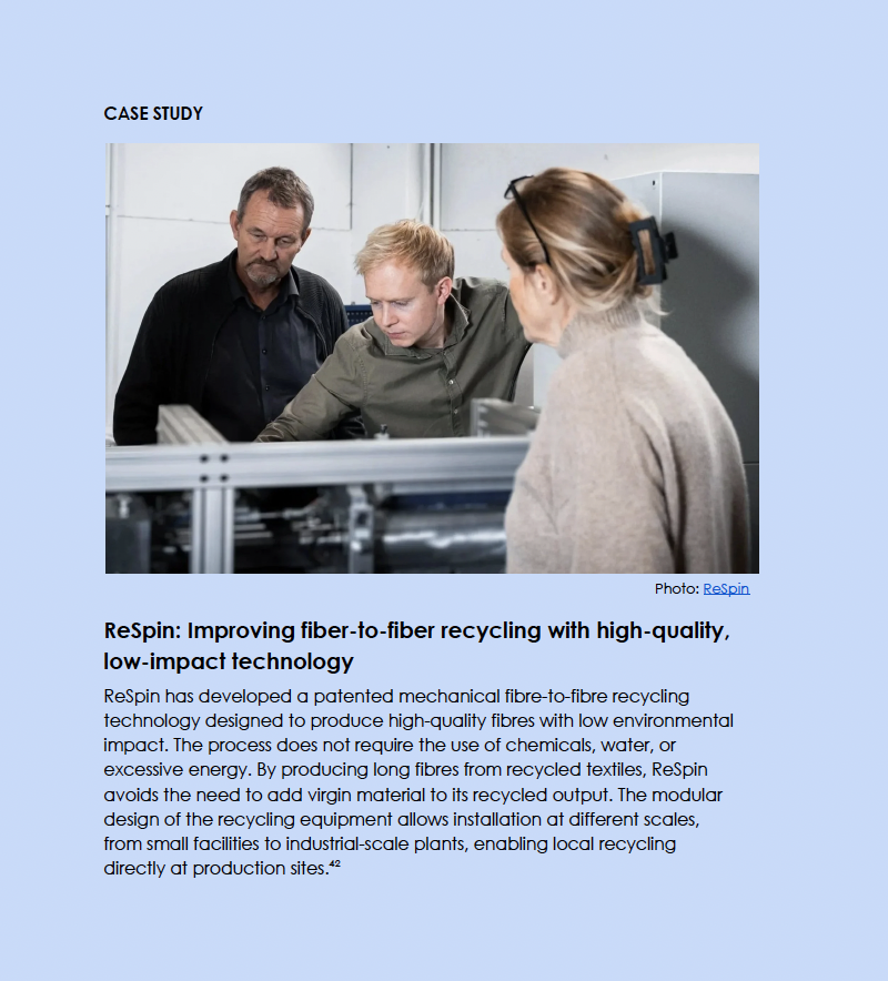 Within this context, Respin is recognised for its fibre-to-fibre recycling technology. As described in the report: